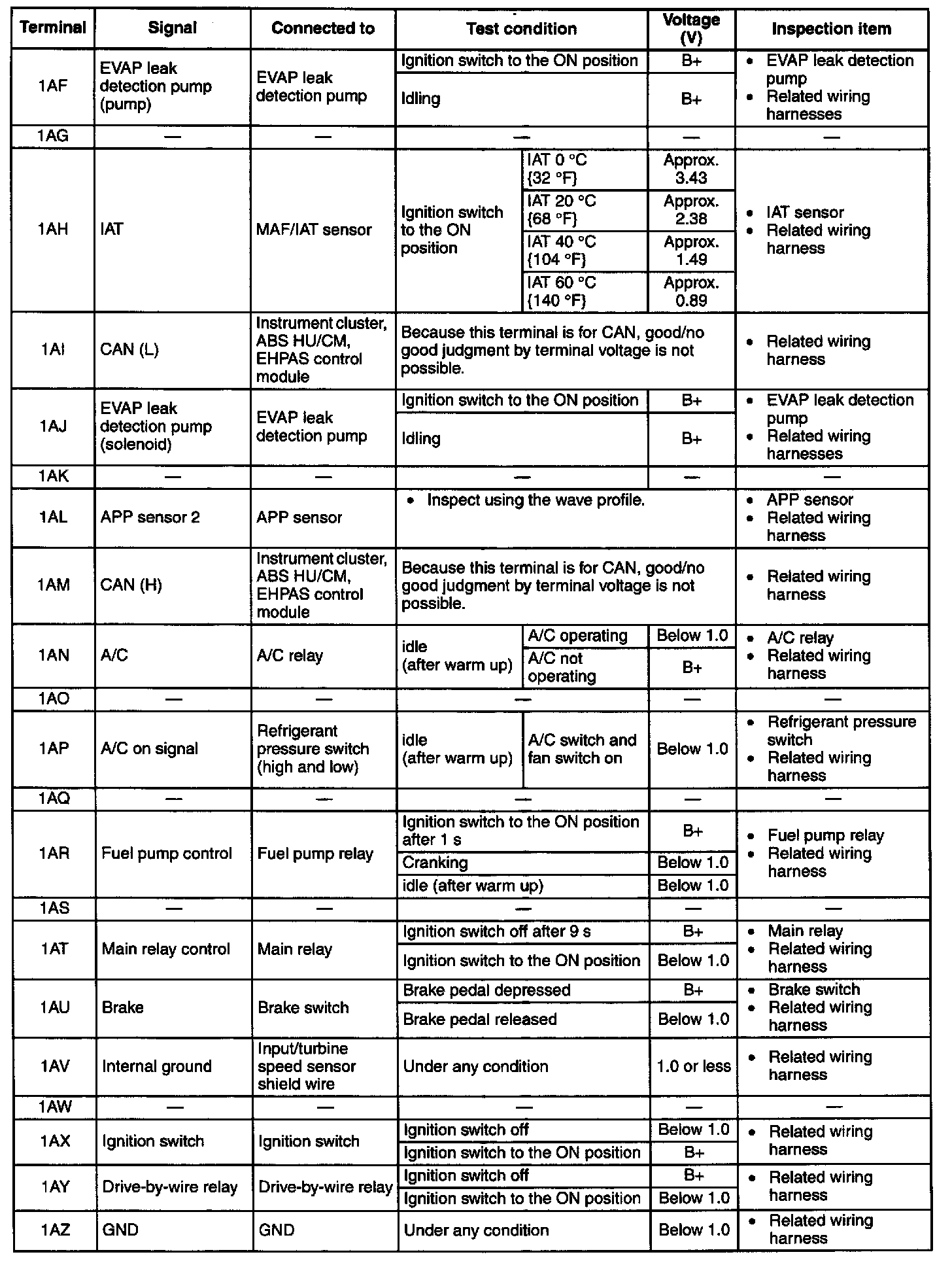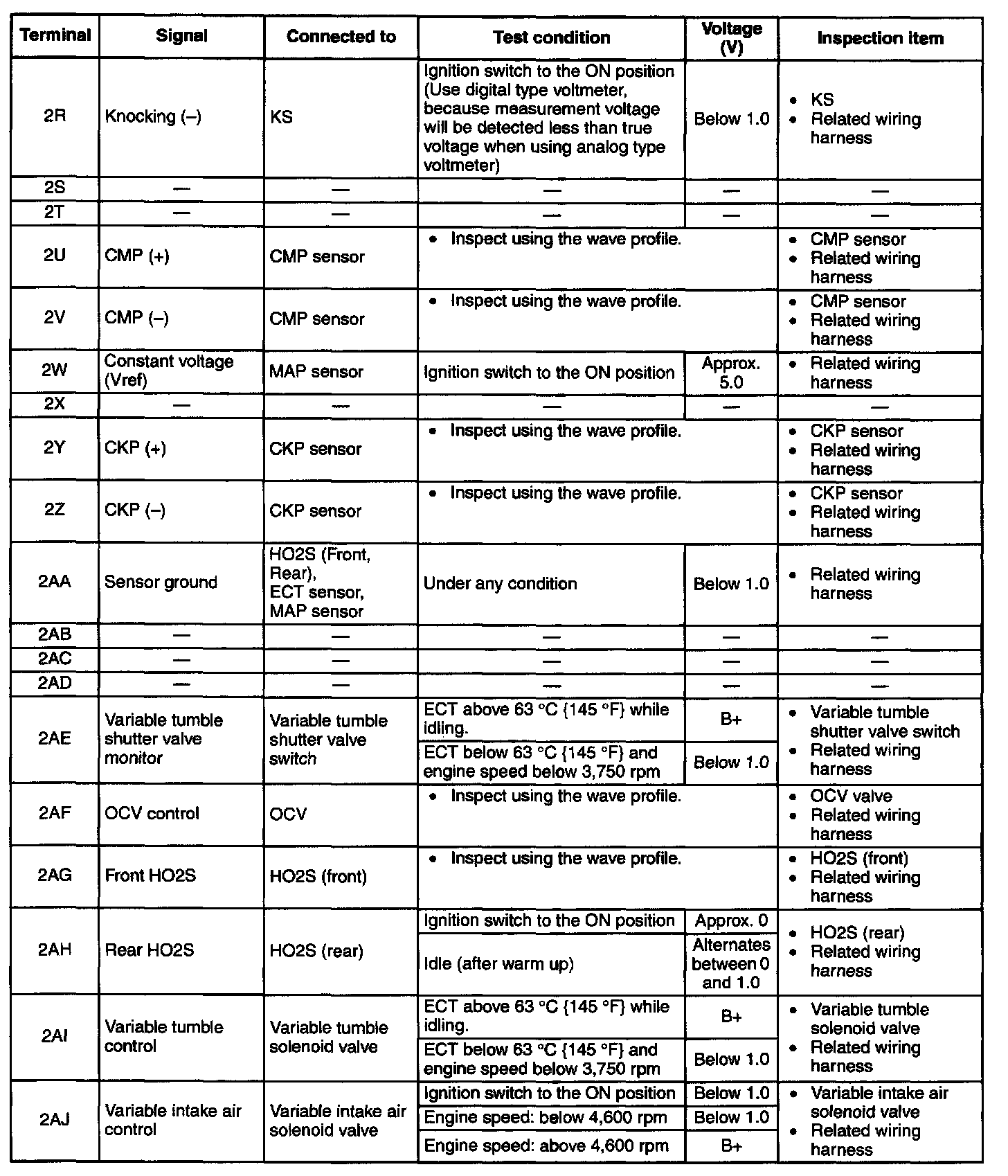 NOTE: The PCM terminal voltage can vary with the conditions when measuring and changes due to aged deterioration on the vehicle, causing false diagnosis. Therefore determine comprehensively where the malfunction occurs among the input systems, output systems, and the PCM.