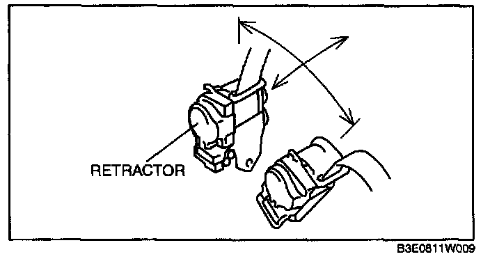 4. While pulling the seat belt out, make sure that the seat belt does not lock when the retractor is tilted slowly up to 15 degree from the mounted position and locks when the retractor is tilted 40 degree or more.