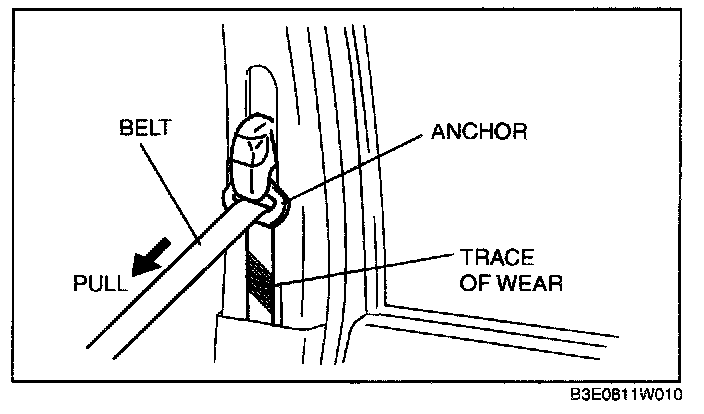 WARNING: When the load limiter operates, the belt and anchor rub against each other strongly leaving wear tracks. If the seat belt is used in this state, the seat belt will not function at its full capability and there is the possibility of serious injury to passengers. Be sure to replace the seat belt once the load limiter operates.