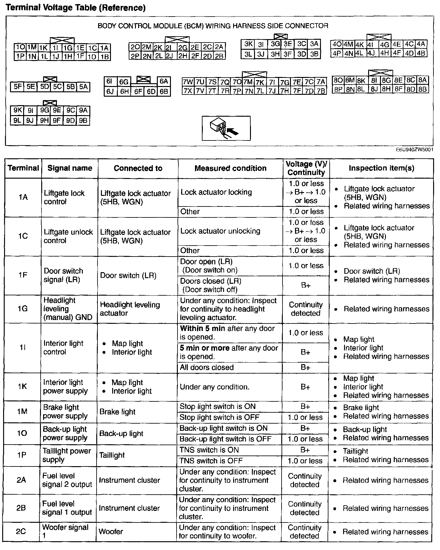 BODY CONTROL MODULE (BCM) INSPECTIONTerminal Voltage Table (Reference) - Terminals (1A -2C):