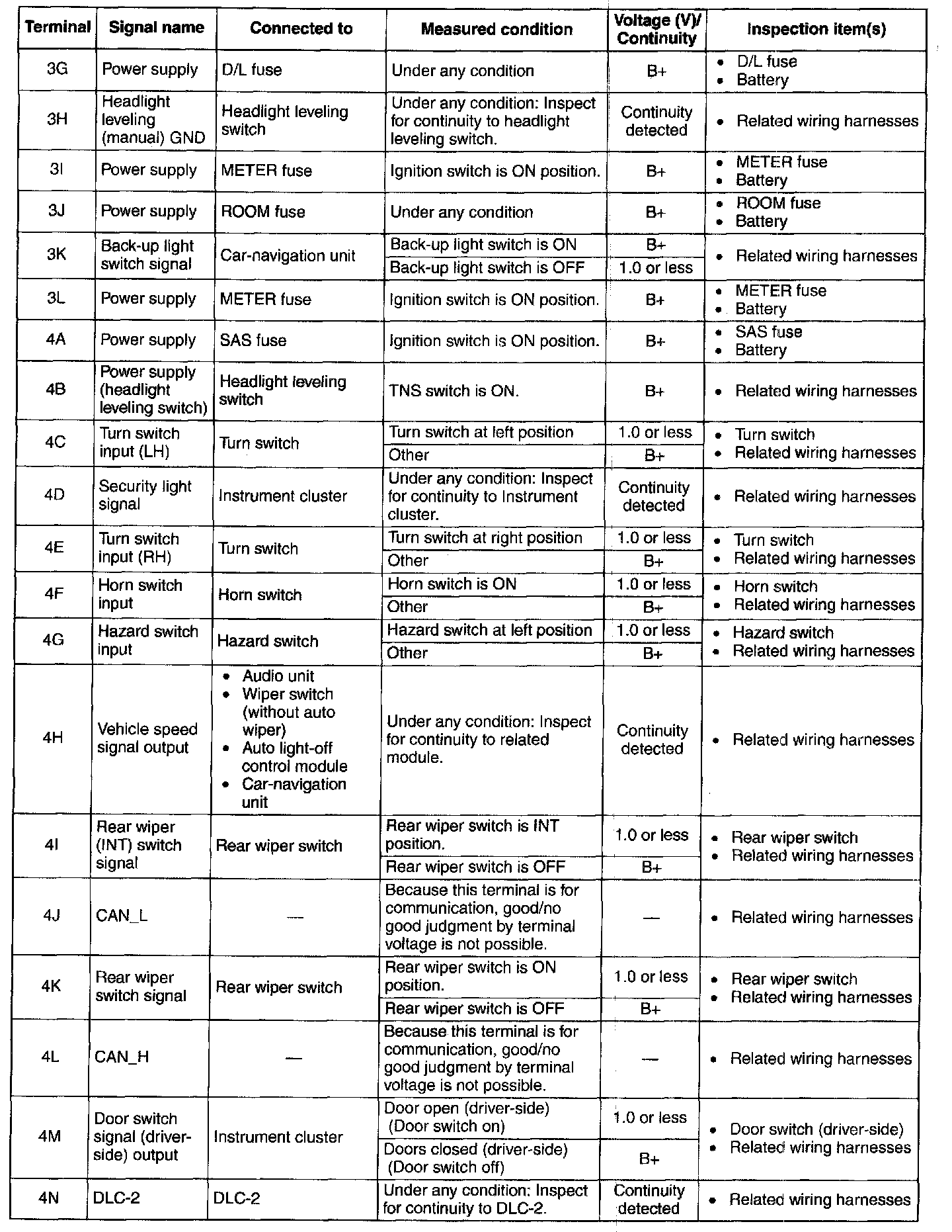 1. Measure the voltage or inspect for continuity according to the Terminal Voltage Table (Reference).