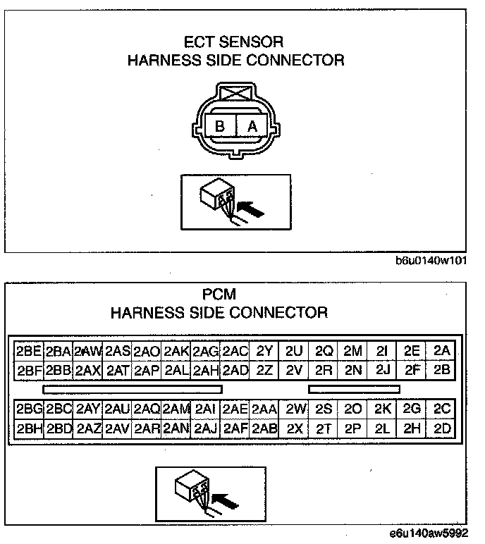 - ECT sensor terminal B and PCM terminal 2AY