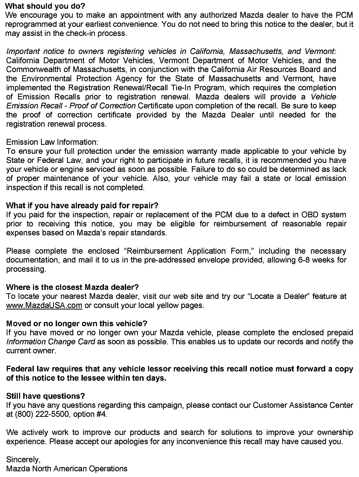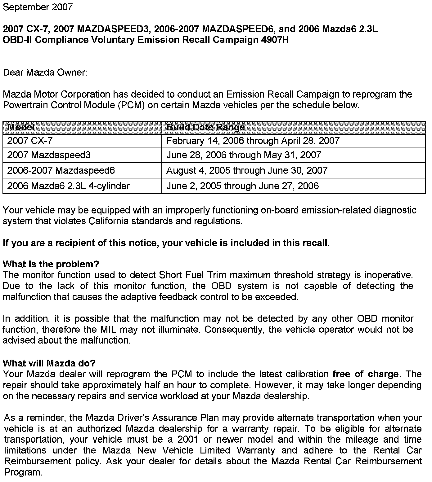 Recall - ECM Update for OBD Functions