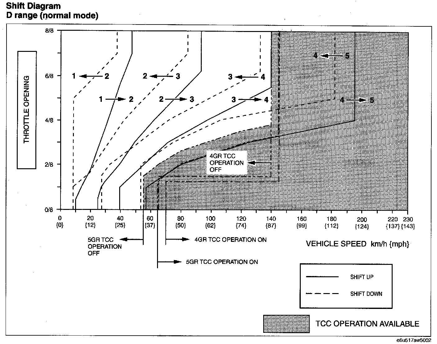 6. Drive the vehicle and verify that TCC operation is obtained in 4GR and 5GR. The operation points must be as shown in the table below.