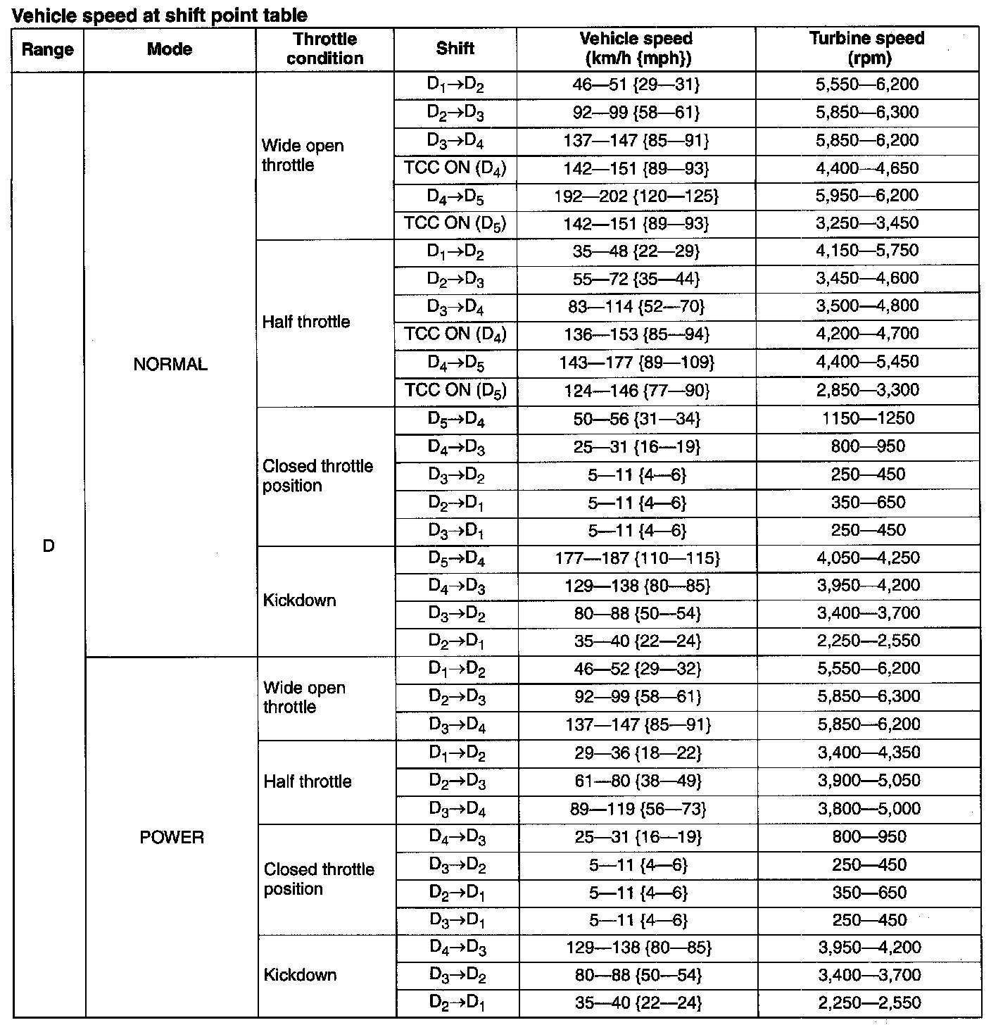 5. Drive the vehicle in 5GR, 4GR, 3GR, and 2GR and verify that kickdown occurs for 5 -> 4, 4 -> 3, 3 -> 2, 2 -> 1 downshifts, and that the shift points are as shown in the table below.