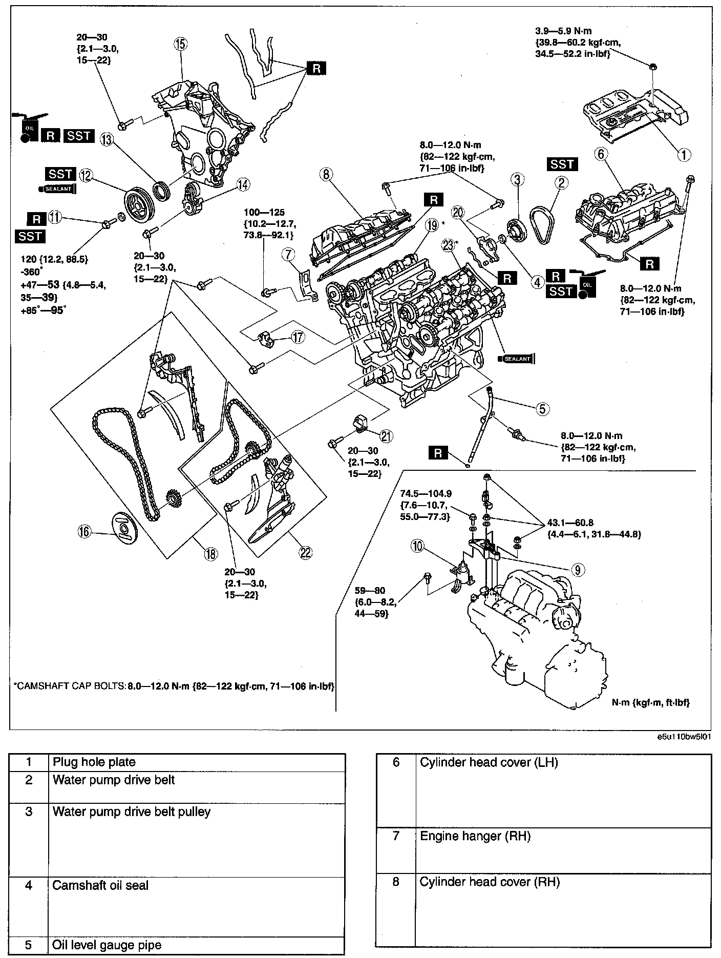 2. Remove the RH camshaft thrust caps 1R and 5R.