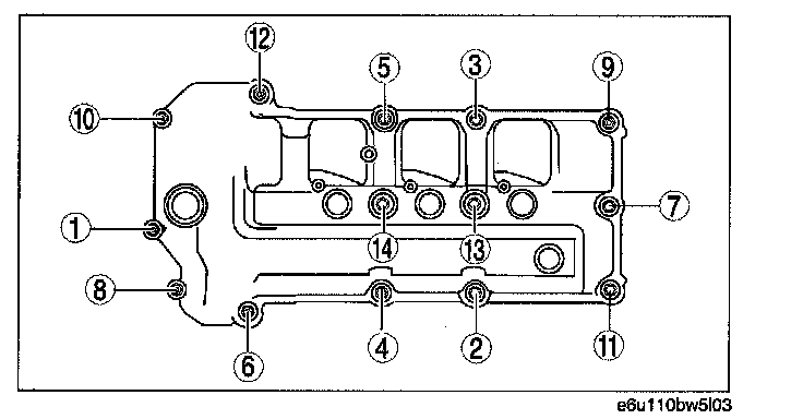 ^ Cylinder head and the camshaft bearing caps are numbered to make sure they are assembled in their original position. When removed, keep the bearing caps with the cylinder head from where they were removed together. Do not mix the caps.