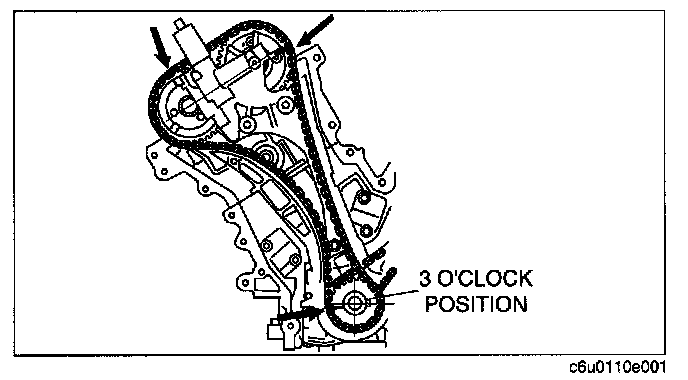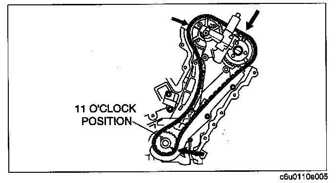 ^ If timing marks in the timing chains are not evident, use a permanent-type marker to mark the crankshaft and camshaft timing marks on the timing chain.