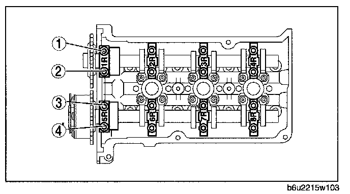 ^ After adjusting the camshaft end play using the thrust caps 1R and 5R, tighten the other bearing caps.