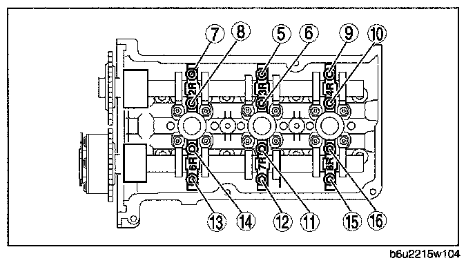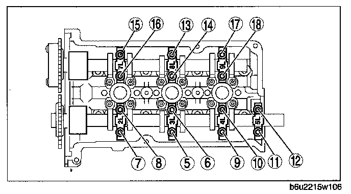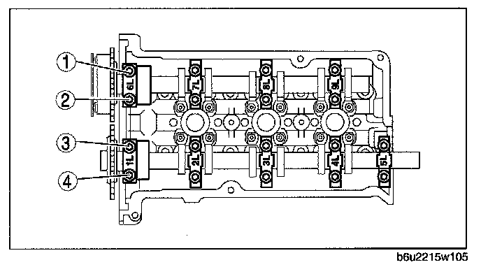 ^ After adjusting the camshaft end play using the thrust caps 1L and 6L, tighten the other bearing caps.