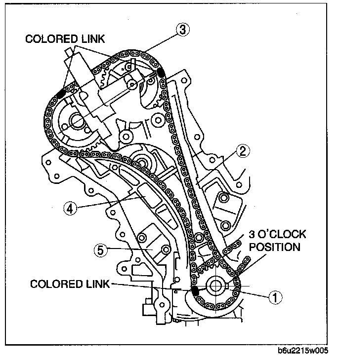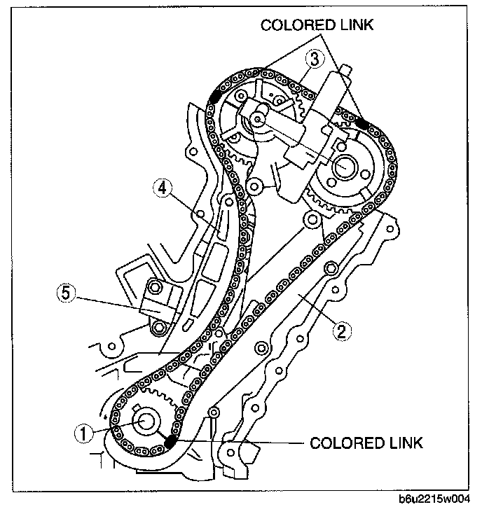 ^ Install the timing chain by aligning the colored links on the timing chain with the marks on the timing sprockets.