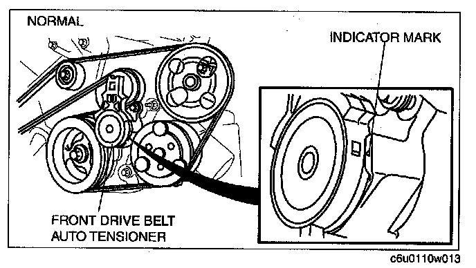 1. Verify that the front drive belt auto tensioner indicator mark does not exceeds the limit.