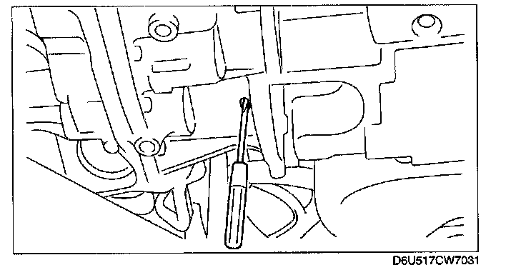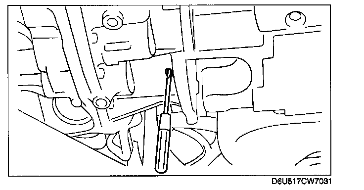 2. Insert a flathead screwdriver through the converter housing service hole, and lock the drive plate.