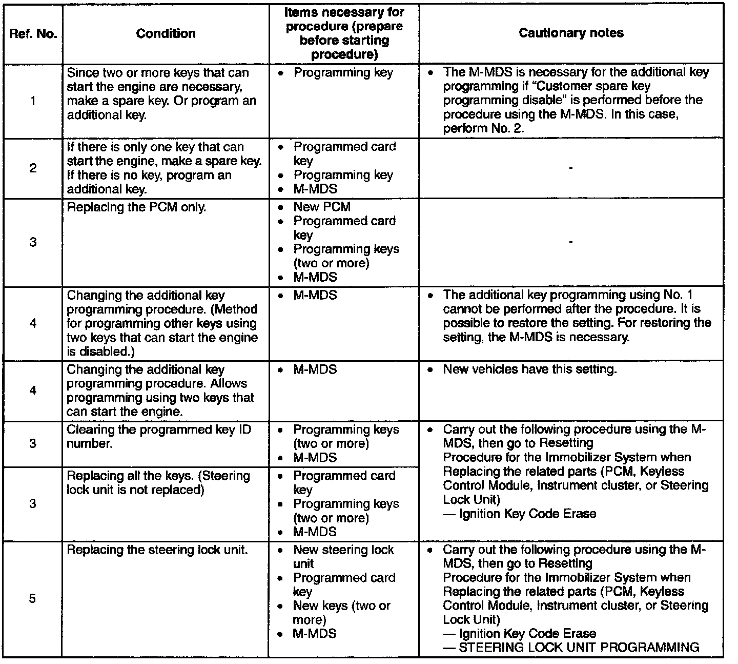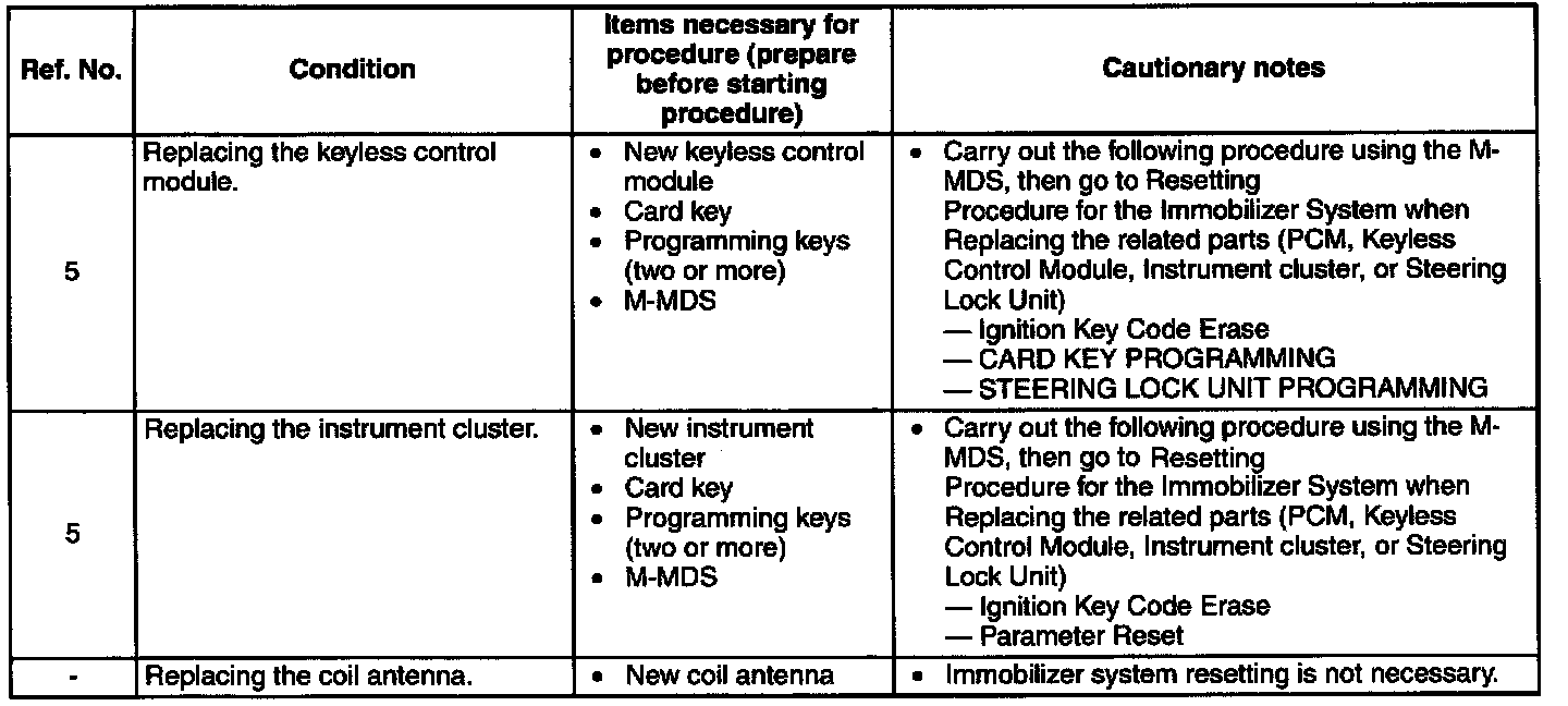 - When performing the following procedures, the immobilizer resetting procedure using the M-MDS must also always be performed: "Keyless control module replacement", "PCM replacement", "Steering lock unit replacement", "Keyless control module and PCM joint replacement", "Keyless control module, PCM, and steering lock unit joint replacement", and "Key ID number clearing". The engine will not start unless all work is performed using the M-MDS.