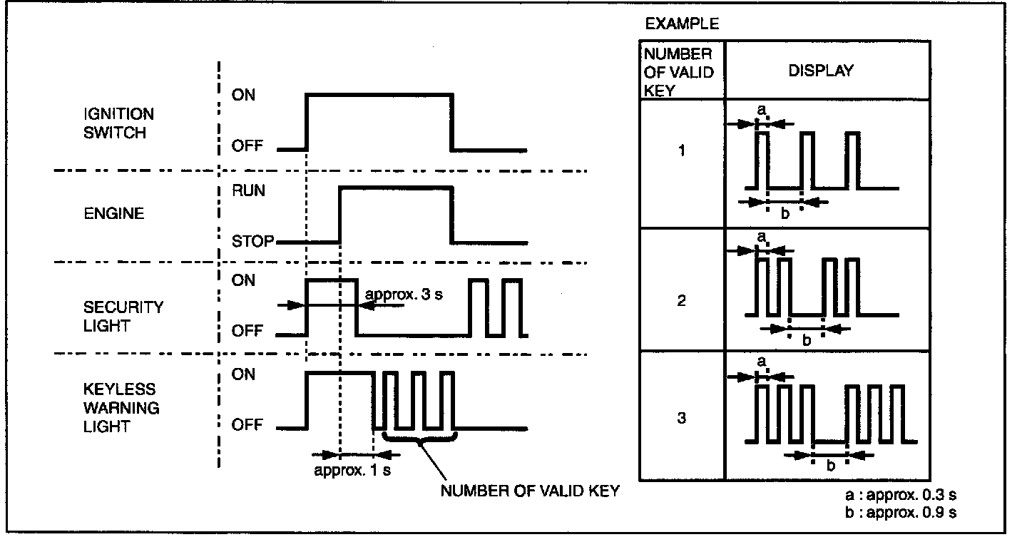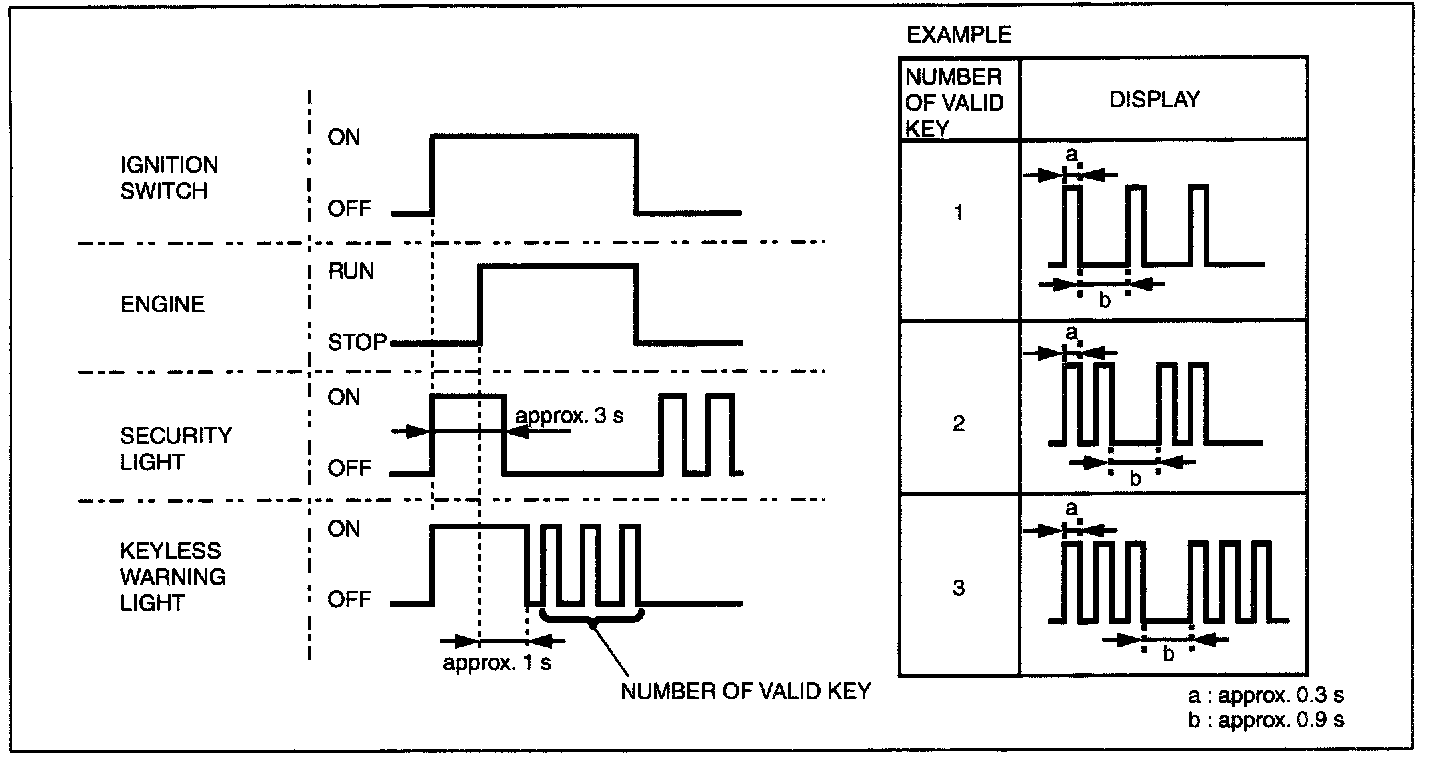 - From the point that ignition switch is turned to the ON position, the security light illuminates or approx. 3 s, and goes out.
