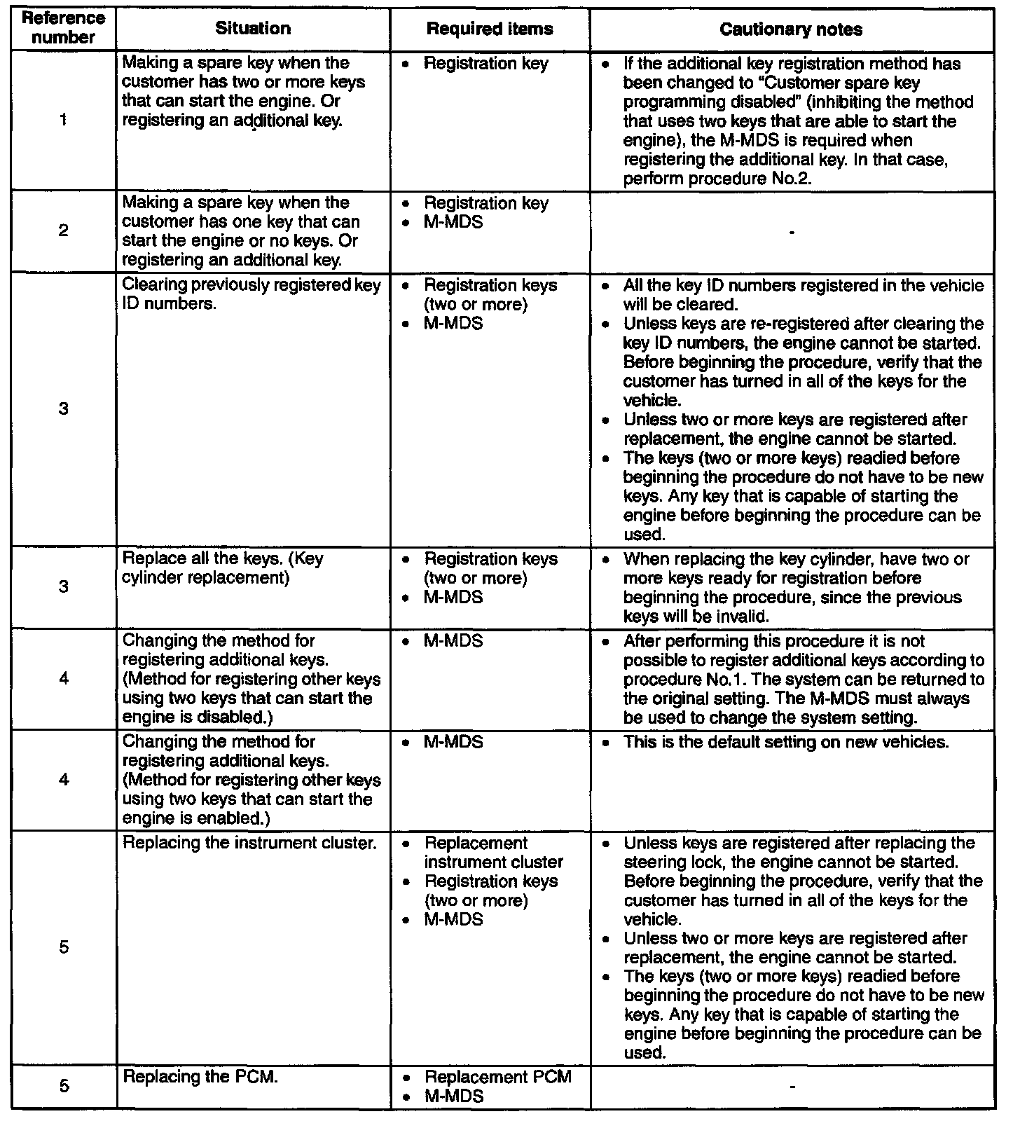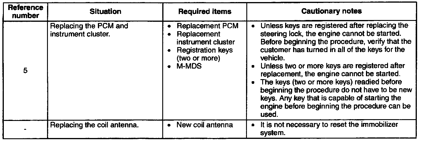 - When performing the following procedures, the immobilizer resetting procedure using the M-MDS must also always be performed: "instrument cluster replacement", "PCM replacement", "instrument cluster and PCM joint replacement", "Key ID number clearing". The engine will not start unless all work is performed using the M-MDS.