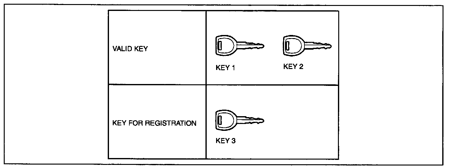 - If eight keys have already been registered, and it is necessary to register other keys, the previously registered key ID numbers must first be cleared. To clear the key ID numbers, refer to "No.3 Key Replacement Procedure (Clearing Previously Registered Key ID Numbers, Key Re-registration)".