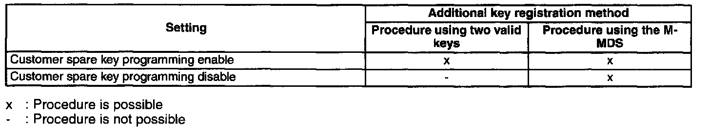 - By disabling the "No.1 Additional Key Registration Procedure (Using Two Valid Keys)", only the M-MDS can be used to register additional keys, thereby preventing two valid keys from being used to create an unauthorized spare key. This function is for use by rental car or other companies with vehicle fleets.