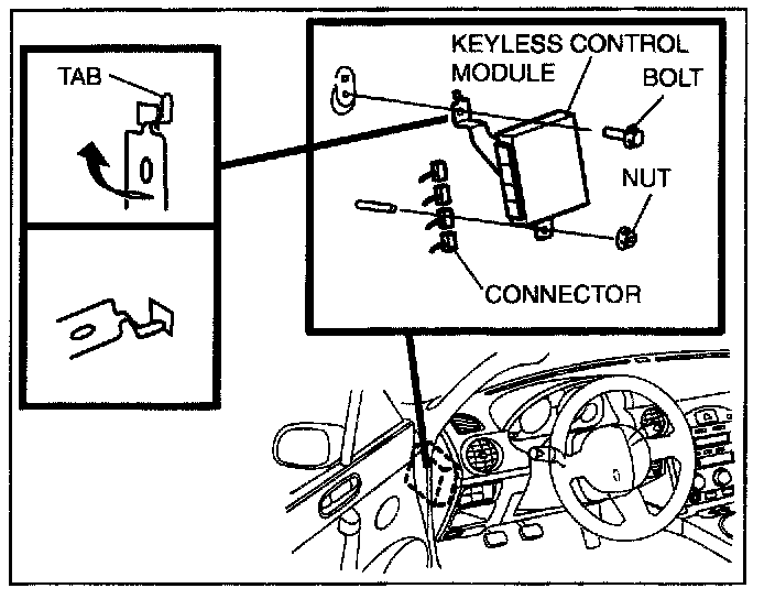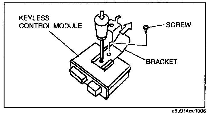 NOTE: The screw which fixes the keyless control module and bracket is for a body ground connection. Be sure to secure the screw when installing