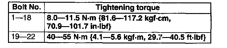Tightening torque: 18 - 22 Nm (1.9 - 2.2 kgf-m, 13.3 - 16.2 ft. lbs.)