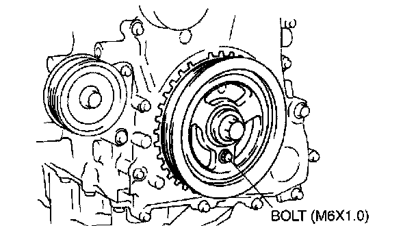 3. To position the crankshaft pulley, temporarily tighten it and, using a suitable bolt (M6 X 1.0 length 25 mm - 35 mm (0.99 - 1.37 inch)), fix the crankshaft pulley to the engine front cover.