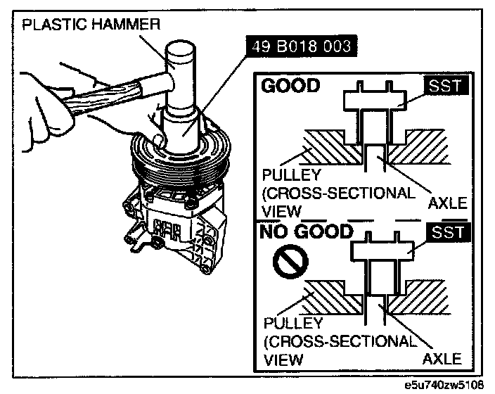 1. Install the inner wheel of the pulley using a plastic hammer and SST (49 B018 003) to the compressor.