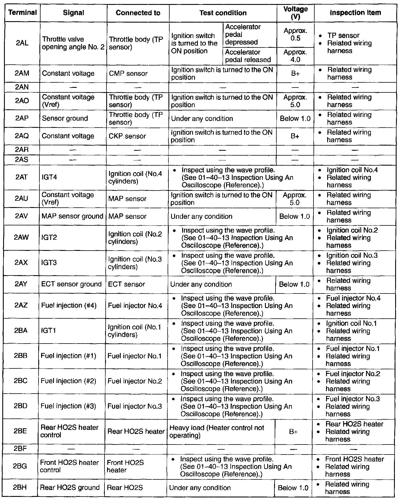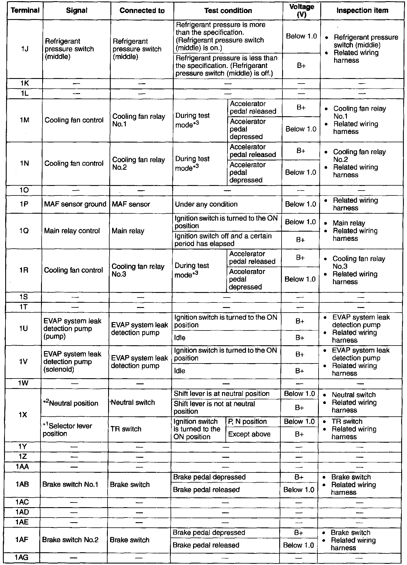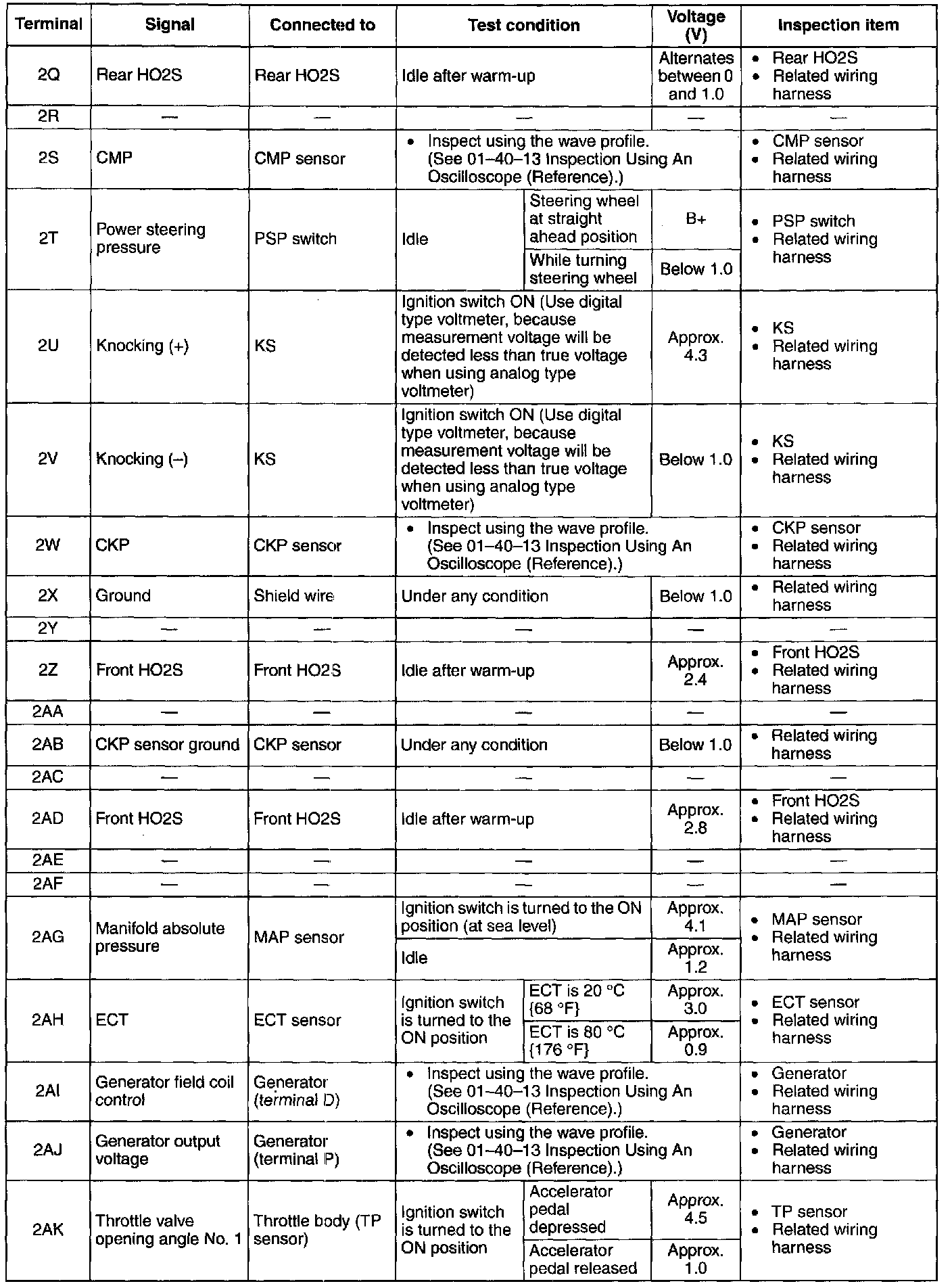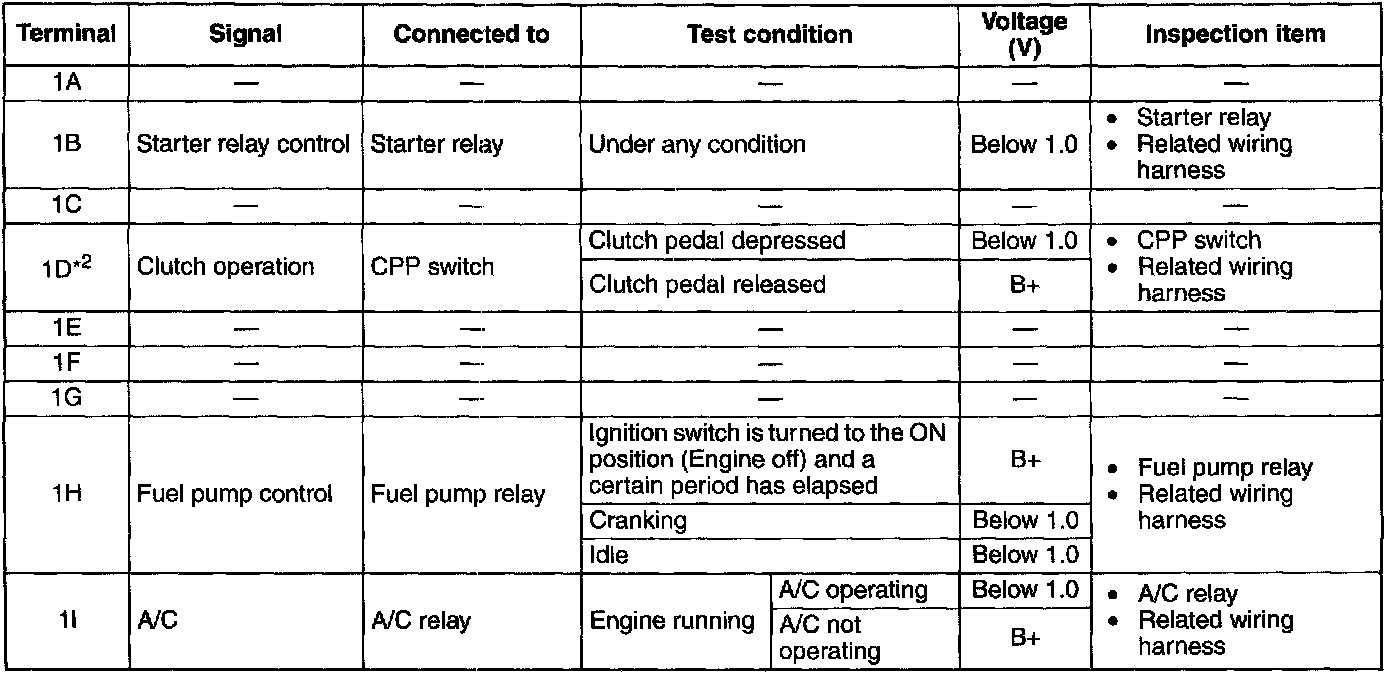 NOTE: The PCM terminal voltage can vary with the conditions when measuring and changes due to aged deterioration on the vehicle, causing false diagnosis. Therefore determine comprehensively where the malfunction occurs among the input systems, output systems, and the PCM.