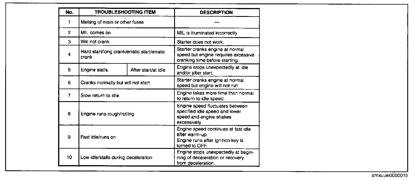 - The appropriate diagnostic inspection relating to malfunction cause as specified by the symptoms can be selected by looking down the diagnostic inspection column of the chart.
