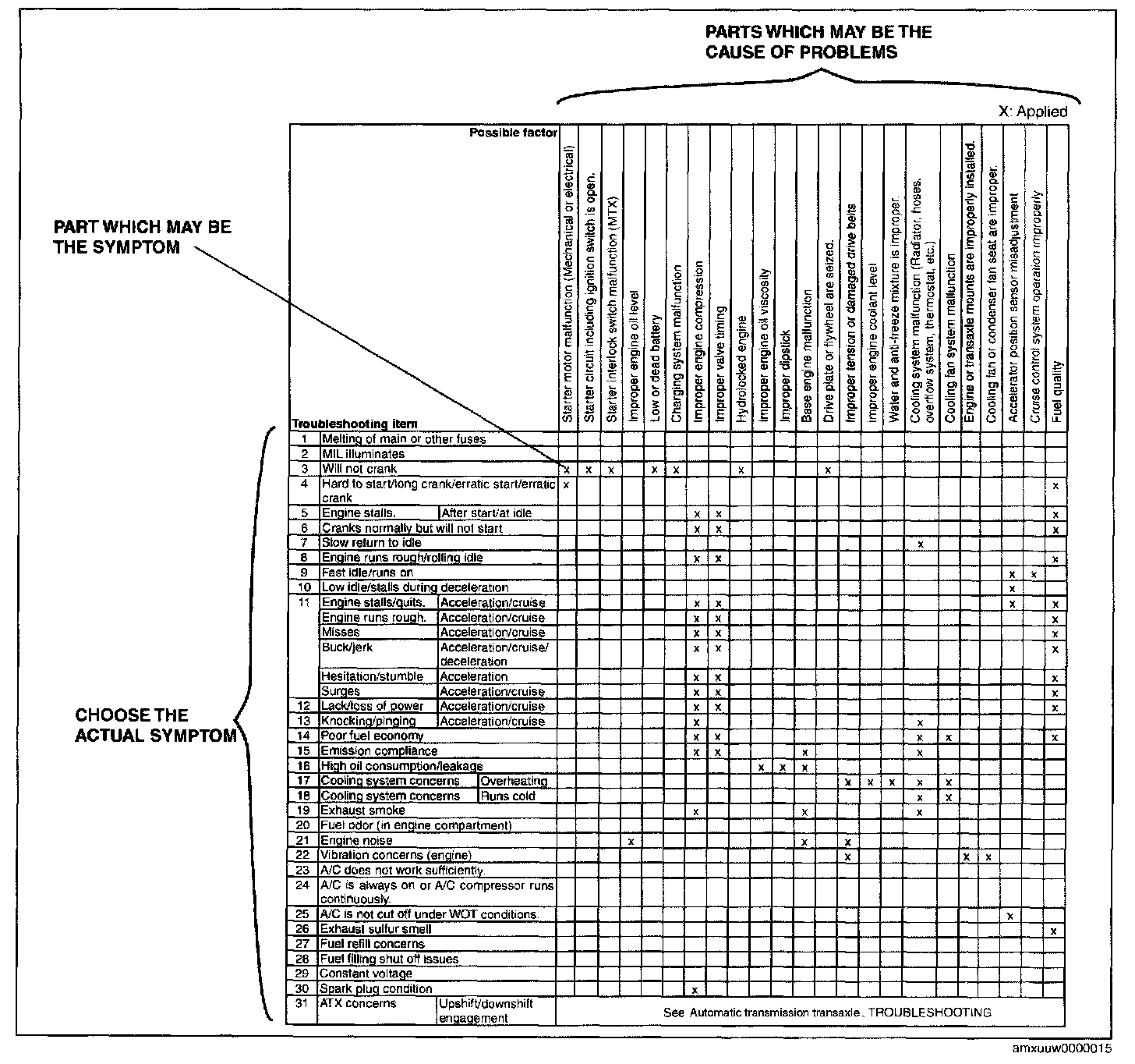 - The chart is effective in quickly narrowing down the relation between symptom and cause of the malfunction. It also specifies the area of the common cause when multiple malfunction symptoms occur.