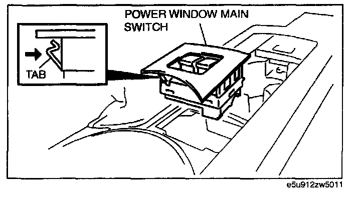 4. Depress the tab and remove the power window main switch.