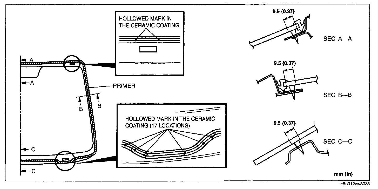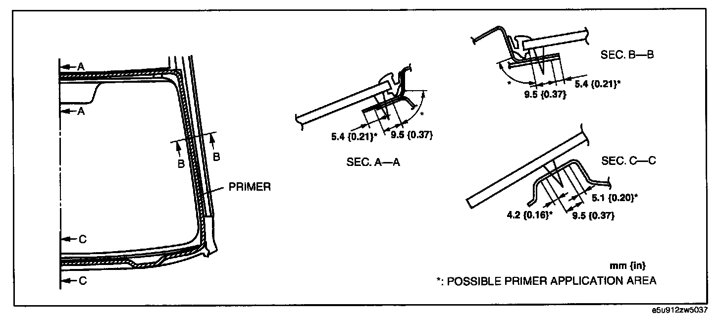 8. If the sealant has come off completely in any one place, apply some primer after degreasing, and allow it approx. 30 min to dry. Then apply 2 mm (0.07 in) thickness of new sealant.