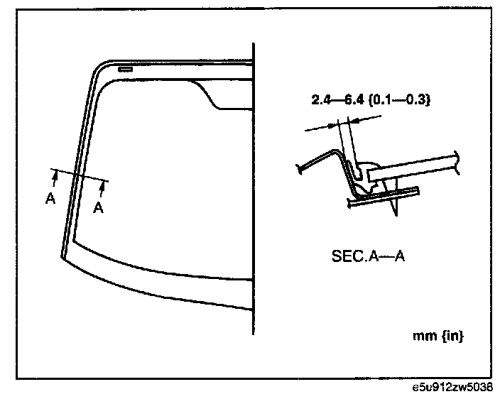13. Verify that the clearance of the A-pillar is within the range shown in the figure, and press along the perimeter of the glass.