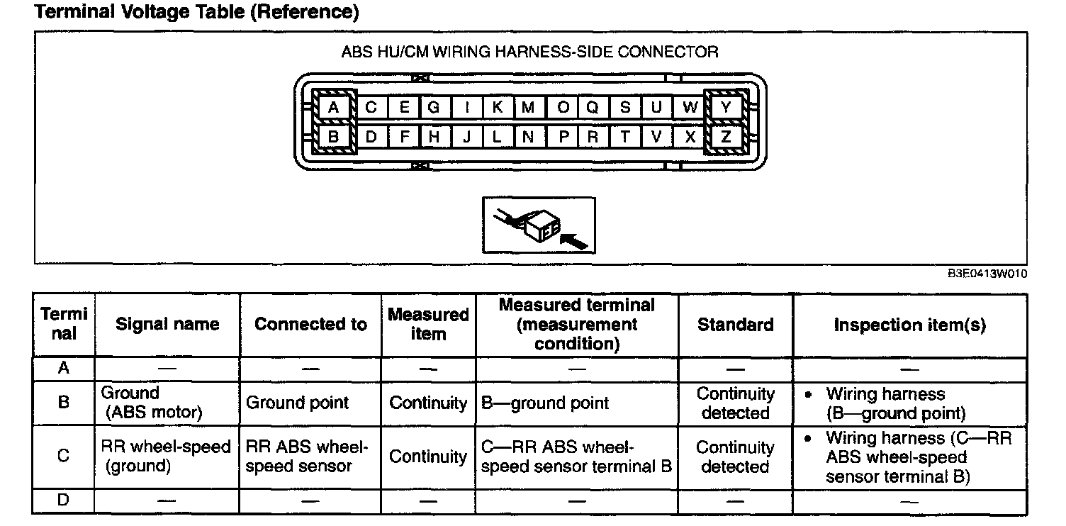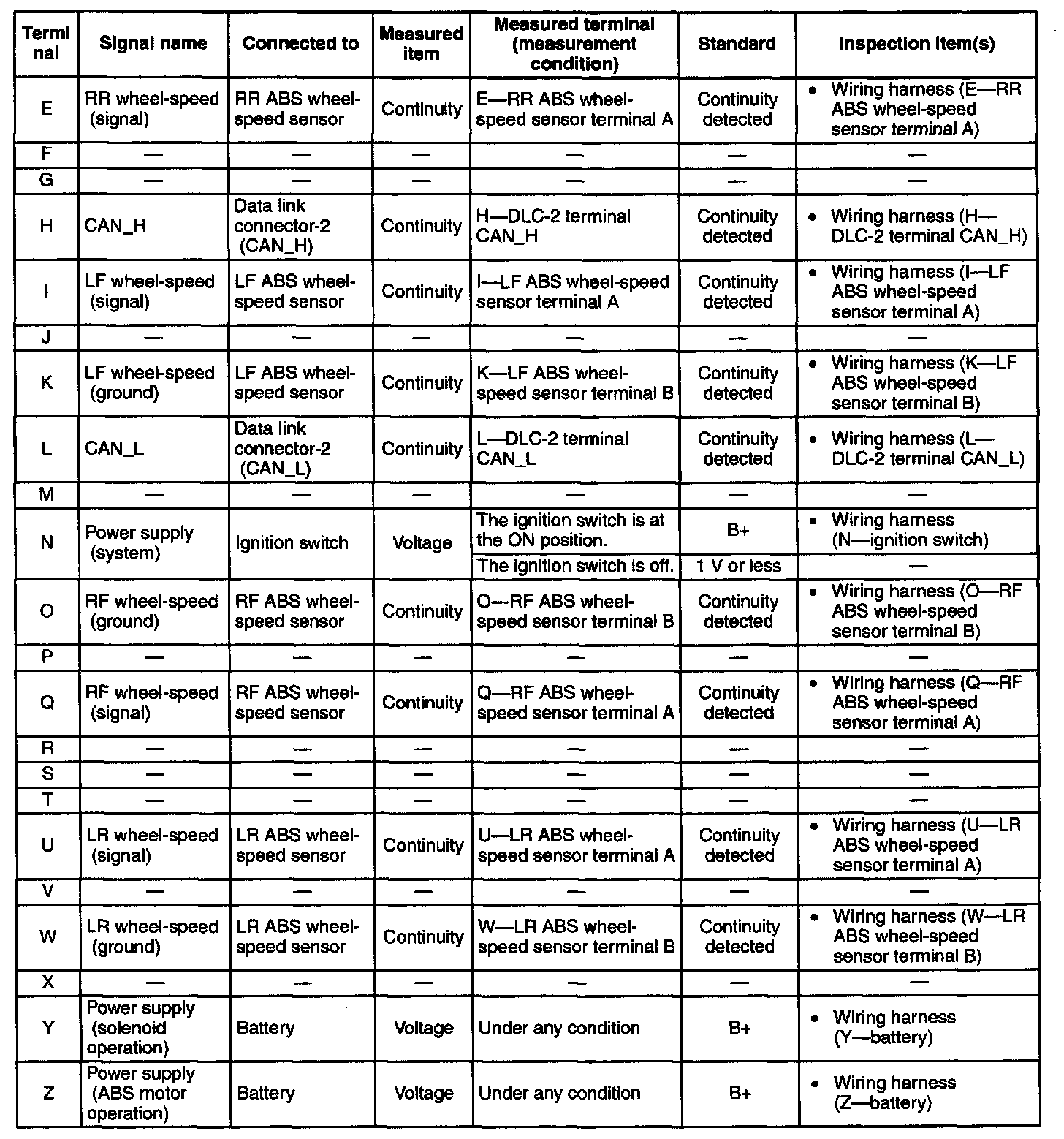 3. Attach the tester lead to the ABS HU/CM wiring harness-side connector, then inspect the voltage, continuity, or resistance according to the standard (reference) on the table.