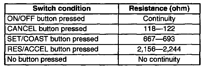 5. Inspect for resistance and continuity between cruise control switch terminals A-G using a tester.