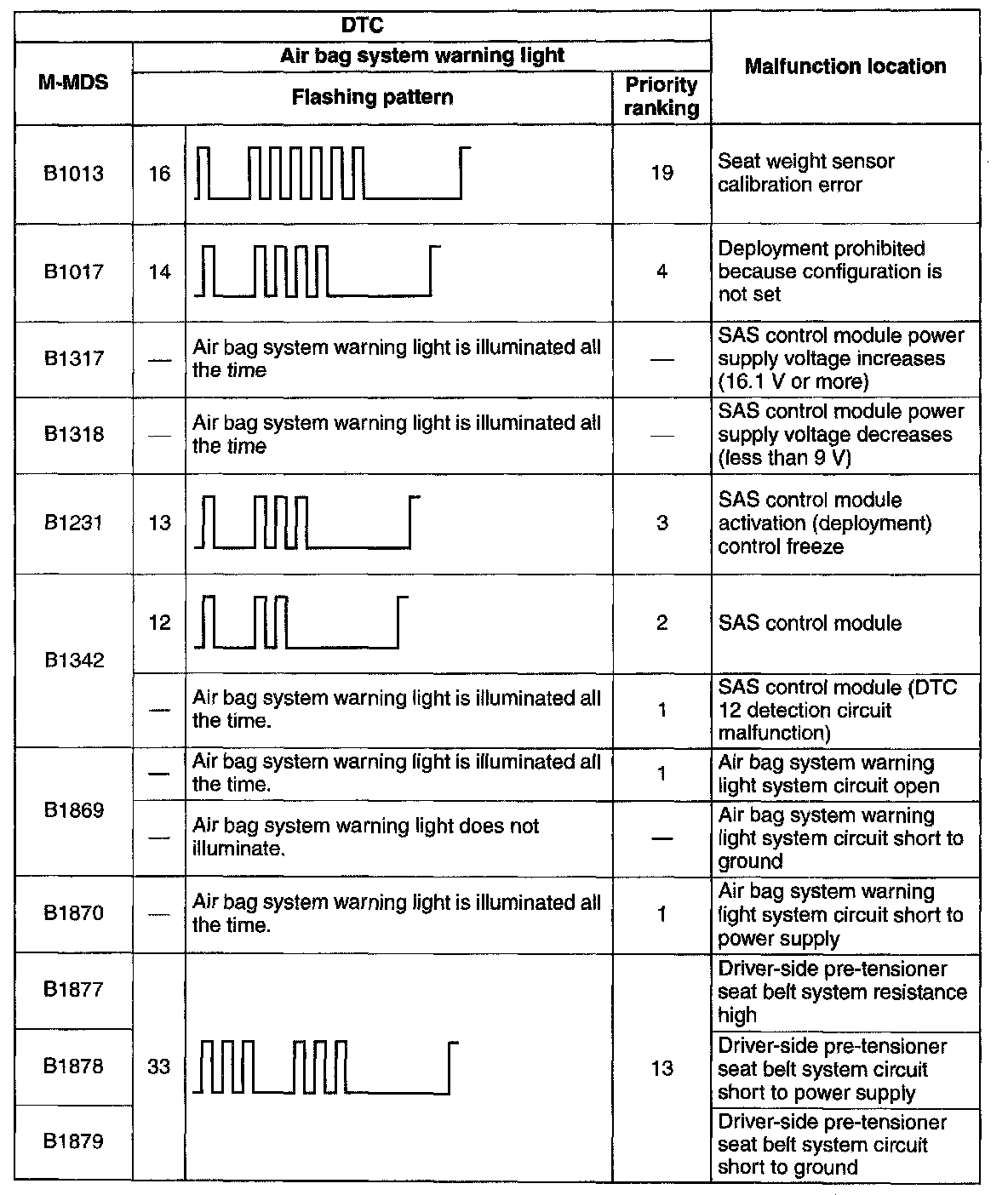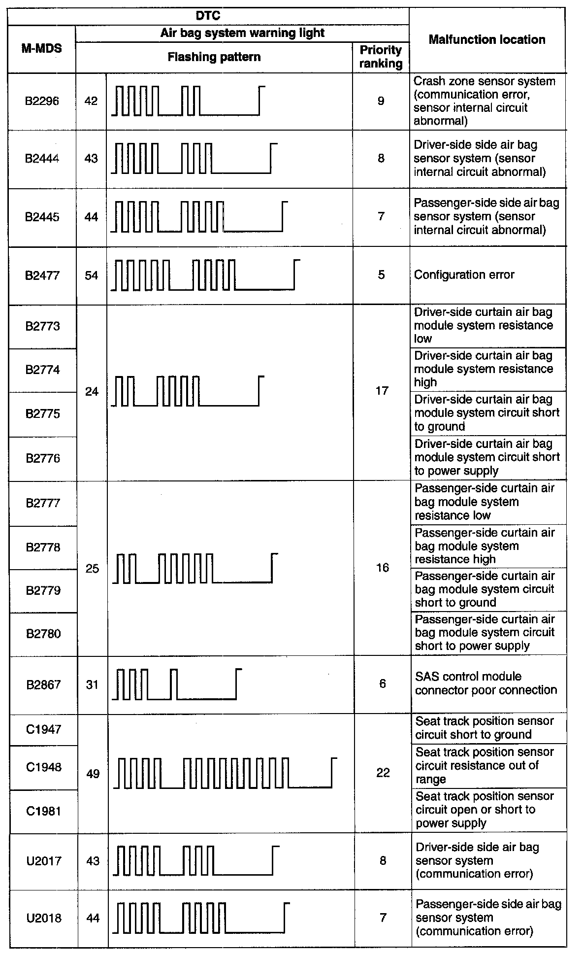 - When DTCs not shown in the DTC table are displayed, replace the SAS control module.