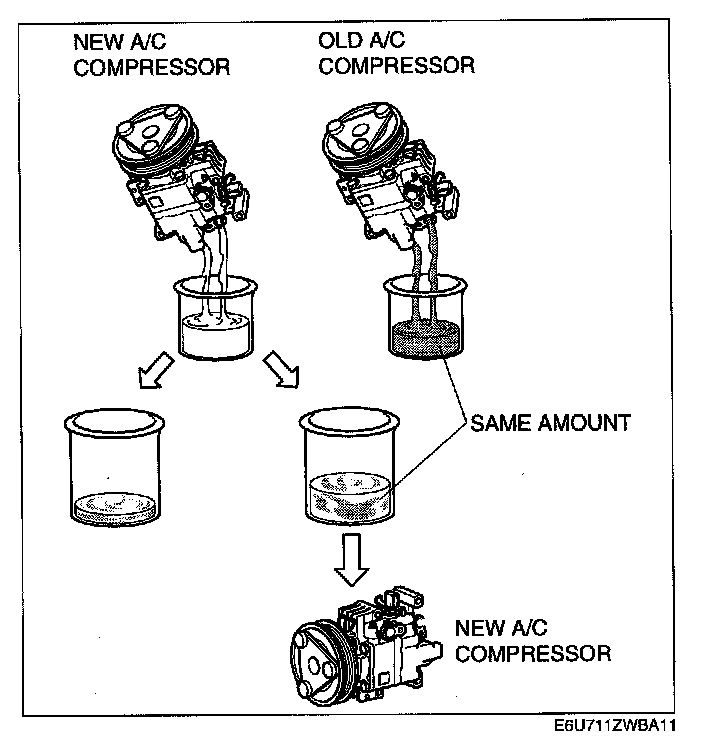 1. Rotate new A/C compressor shaft six to eight revolutions while collecting refrigerant oil in a clean measuring device. Use this refrigerant oil to refill new compressor. Do not allow refrigerant oil to become contaminated.