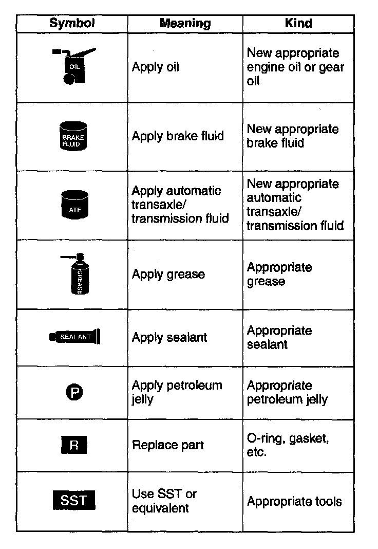 - There are eight symbols indicating oil, grease, fluids, sealant, and the use of SST or equivalent. These symbols show application points or use of these materials during service.
