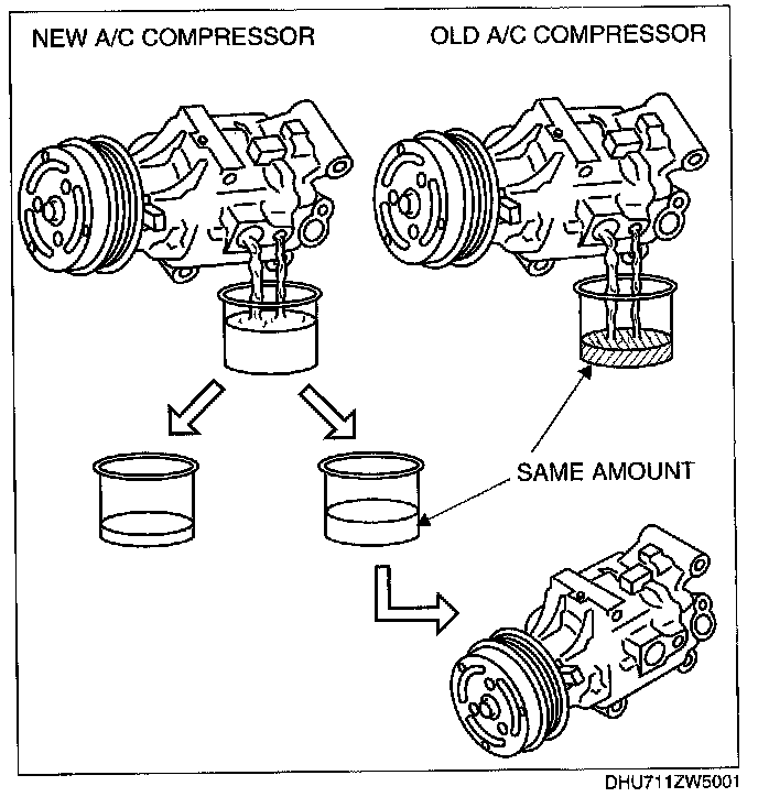1. Rotate new A/C compressor shaft six to eight revolutions while collecting refrigerant oil in a clean measuring device. Use this refrigerant oil to refill new compressor. Do not allow refrigerant oil to become contaminated.