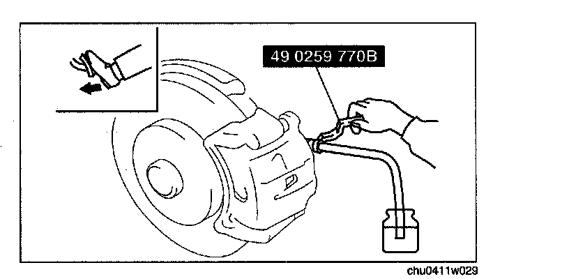 1. Remove the bleeder cap from the brake caliper, and connect a vinyl tube to the bleeder screw.
