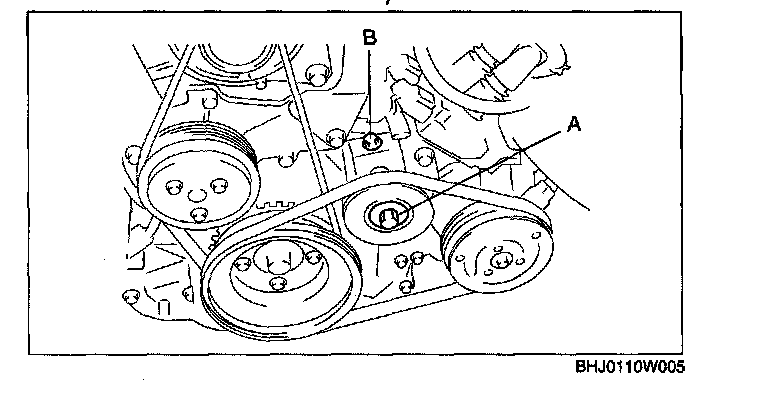3. Adjust the drive belt deflection and tension by turning adjusting bolt B to the specification.
