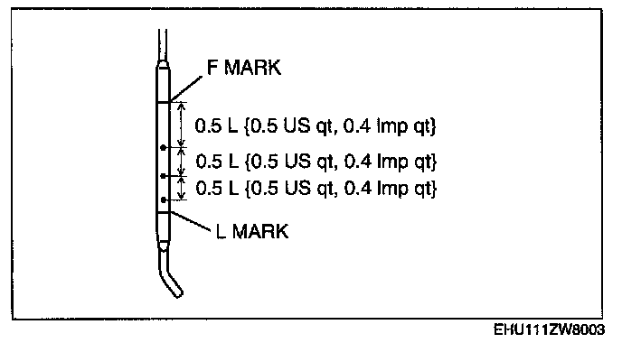 Note: The dipstick is graduated in 0.5 L {0.5 US qt, 0.4 Imp qt} intervals as a reference for oil replenishment.