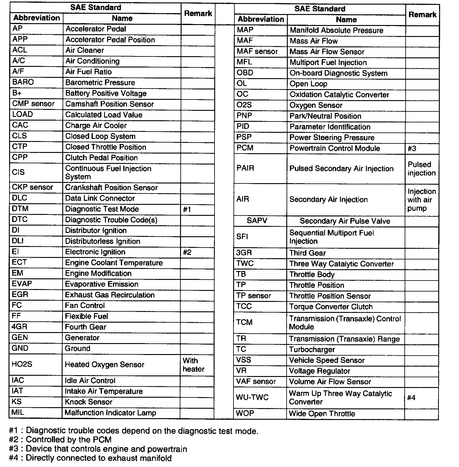 SAE STANDARDS^ In accordance with new regulations, SAE (Society of Automotive Engineers) standard names and abbreviations are now used. The table lists the names and abbreviations that have been used are up to date and their SAE equivalents.