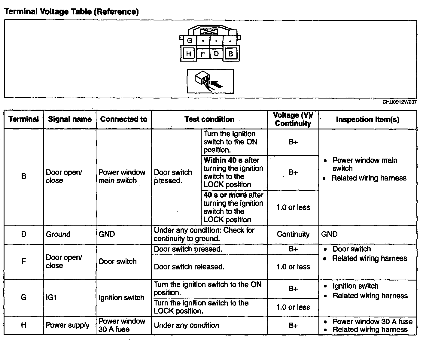 - It the voltage is not as specified in the Terminal Voltage Table (Reference), inspect the parts under "Inspection item(s)".