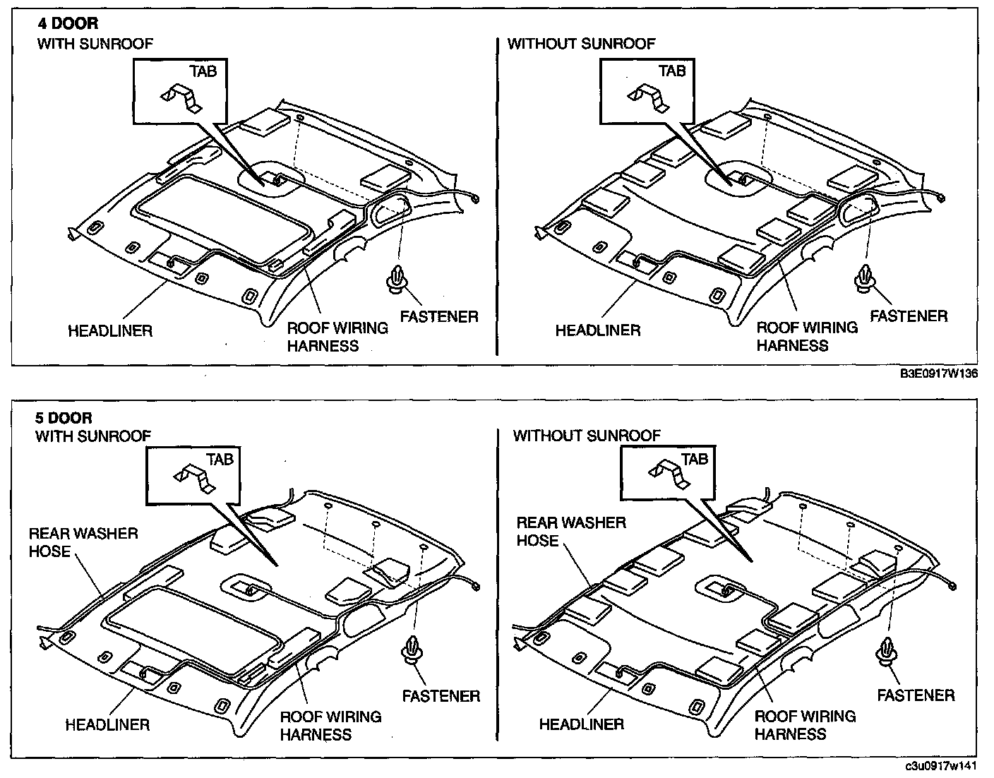 HEADLINER REMOVAL/INSTALLATION1. Shift to the D (ATX) or 4th gear (MTX) position. (4 door)