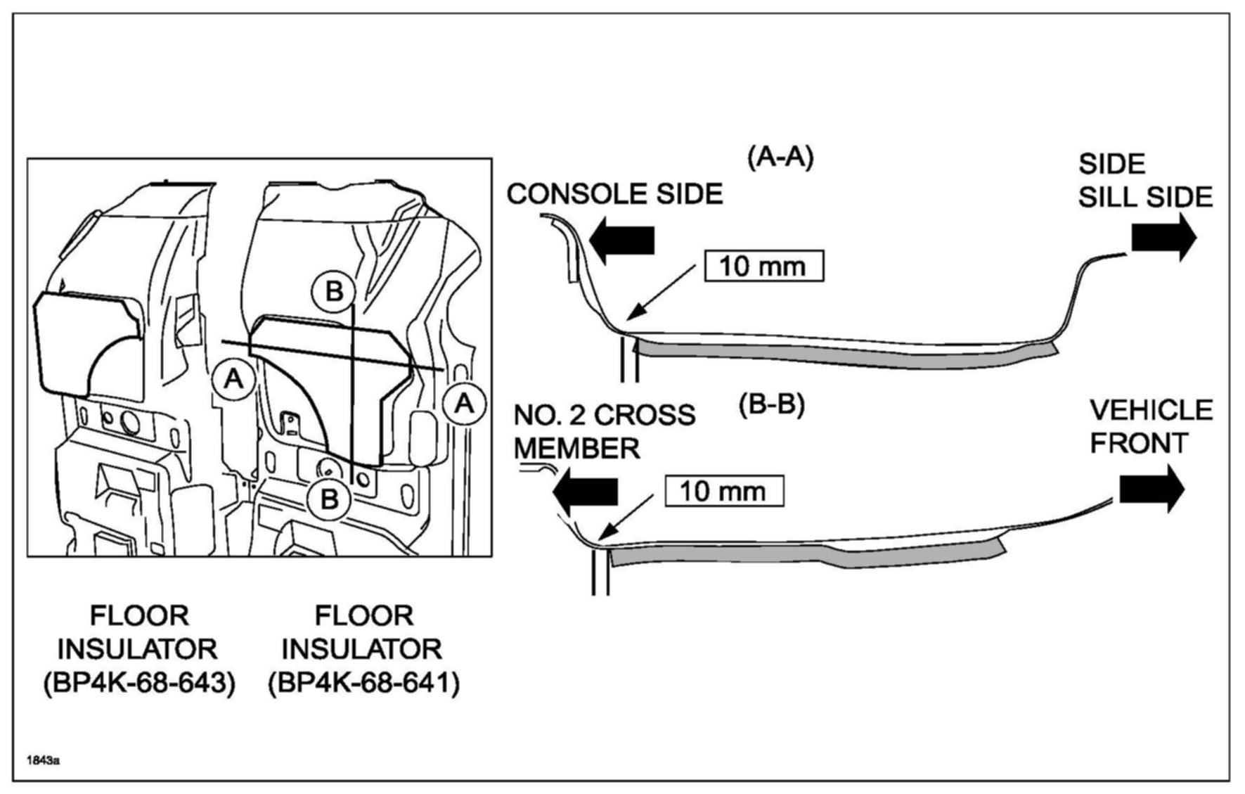 7. To attach the floor insulators, peel off the adhesive backing from the double-sided tape on the floor insulator and attach it to the floor covering approximately 10mm inward from the corner of console side and the No. 2 cross member side.