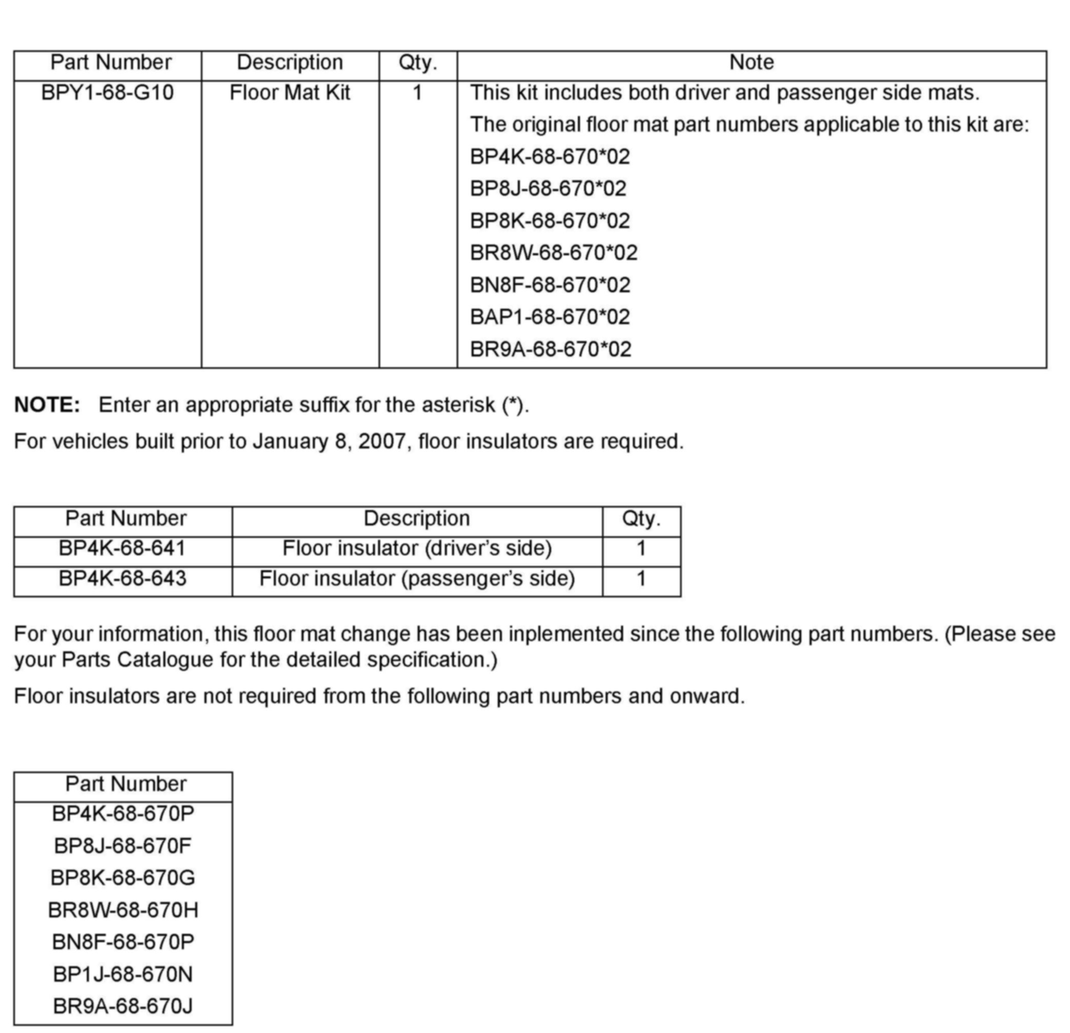 When the service floor mat kit needs to be replaced on vehicles built prior to January 8, 2007, please order floor insulators and the service floor mat kit.