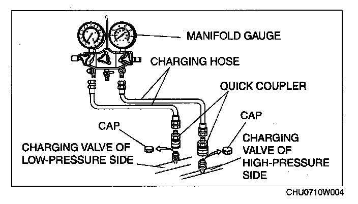 2. Connect the charging hoses to the high- and low-pressure side joints of the manifold gauge.