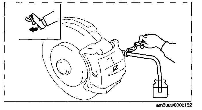 1. Remove the bleeder cap on the brake caliper, and attach a vinyl tube to the bleeder screw.