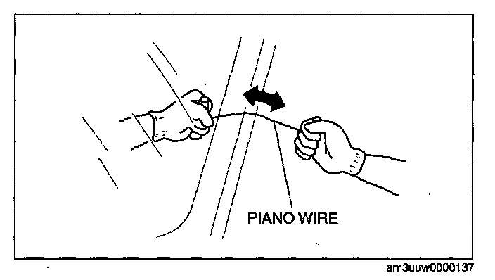 8. Fix one end of the piano wire, and while pulling the other end, cut the sealant around the quarter window glass.