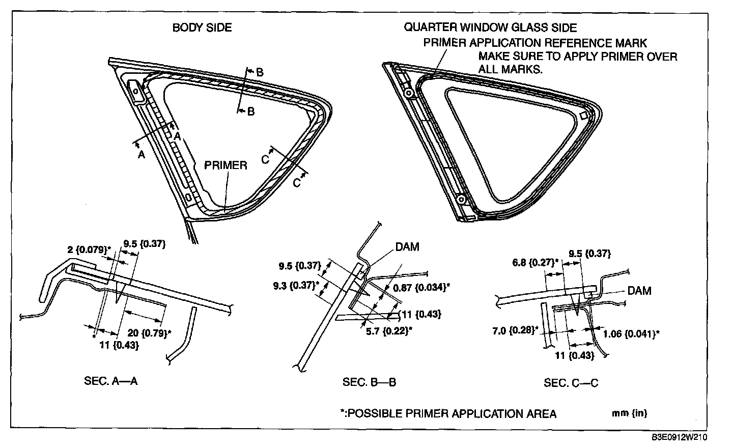5. Use only glass primer on the quarter window glass, and body primer on the body, then allow it to dry for approx. 30 min.